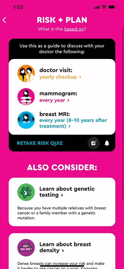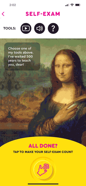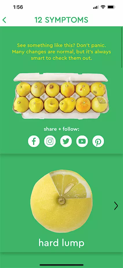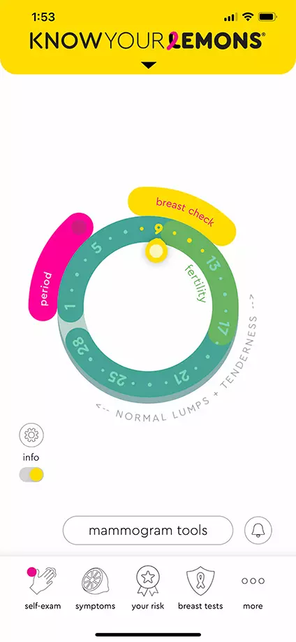 Know Your Lemons is an iOS and Android app that explains 12 ways breast cancer can present and guides users step-by-step with a personalized plan to manage their breast health. It includes a descriptive audio guide to take the guesswork out of conducting self-exams, and a risk assessment quiz that creates a customized screening plan based on personal risk factors. The app cleverly includes a period tracker to provide precise reminders for when to do monthly breast-self exams according to a person's breast cycle and when the ideal time is to book that annual mammogram, which can also be done within the app.
