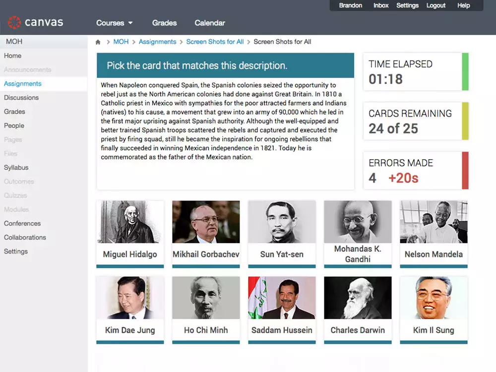 While there is a variety of options you could put into a flash card application, Dr. Brown's budget was limited, so the project was scoped to a specific deck of cards. We built MOH as an LTI Application that extends Canvas so it could be easily incorporated into Dr. Brown's online classes. We designed MOH as a single-page Javascript application to enhance the feel of an interactive game. We refined the timing and types of interactions through user testing with target students. MOH supports LTI grade writeback so that when it's used as a Canvas assignment, it writes back a score to the Canvas gradebook, giving students credit for mastering historical facts.