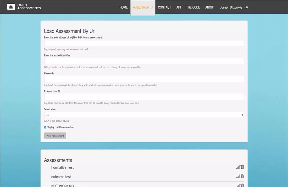 Open Embeddable Assessments (OEA) is an open source platform and widget for embedding assessments in any web page. The player is used both in summative and formative assessments, delivering feedback when used for formative assessment. Styling of the widget can be customized to make it match the environment where quizzes are embedded. Both Lumen Learning and MIT are using it to augment the delivery of open licensed courses. OEA reports student scores back into learning management system gradebooks. In addition, OEA provides application programing interfaces for retrieving analytics.
